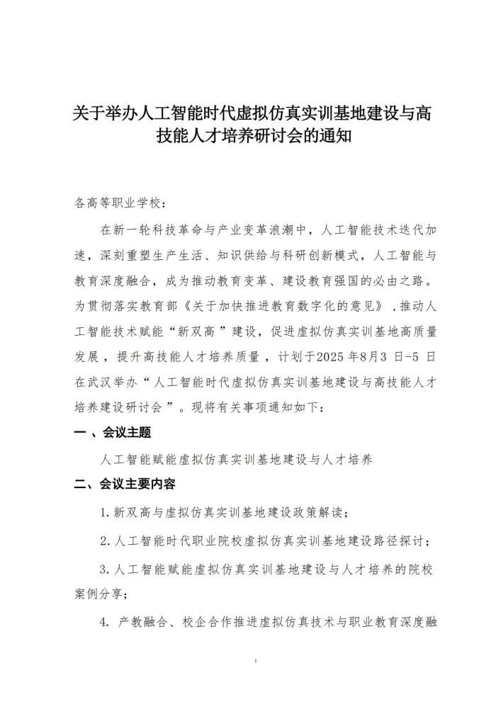 关于举办人工智能时代虚拟仿真实训基地建设与高技能人才培养研讨会的通知