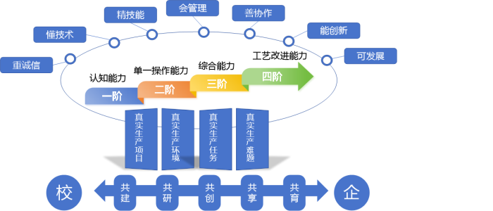 创新性引入生产一线“四真”要素(真实生产项目、环境、任务、难题),驱动学生能力实现“四阶”渐进式跃升:认知能力→单一操作能力→综合能力→工艺改进与创新能力。该模式显著提升了学生的核心职业能力和岗位适应性,实现了校园到岗位的无缝衔接。