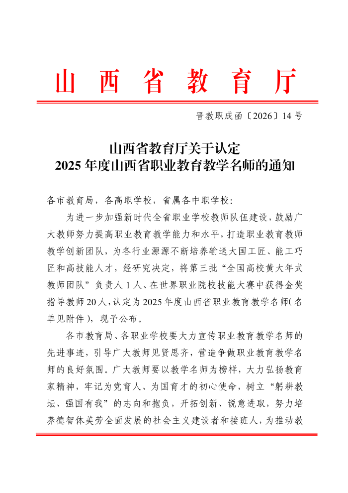 山西省教育厅关于认定2025年度山西省职业教育教学名师的通知