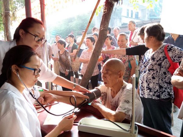 在江北区洋河社区市民学校、铁山坪安置小区义诊现场,志愿者们冒着酷暑骄阳,熟练地为前来义诊的群众进行了血糖、血压的检测,并提供了推拿按摩细致服务,并运用自己的知识为群众解疑答惑。