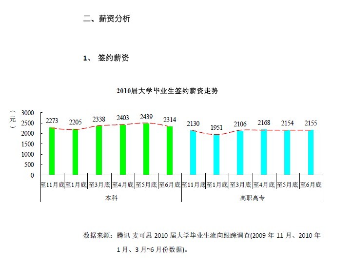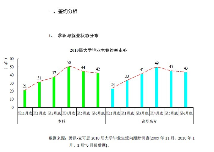1. 腾讯-麦可思调查显示,截至6月25日,2010届本科毕业生签约率为42%,高职高专毕业生为43%。当前大学毕业生签约率仍处于毕业前的波动期,但较上届本科和高职高专毕业生同期签约率仍分别高出2个和10个百分点。从薪资来看,2010届大学毕业生6月平均签约月薪为2235元。其中,本科毕业生平均签约月薪为2314元,较上月(2439)略有下降;高职高专毕业生为2155元,与上月(2154元)基本持平。与上届同期相比,本科与高职高专毕业生的签约月薪分别上升16%、25%。当前应届毕业生整体就业情况与去年同期相比仍然要好。