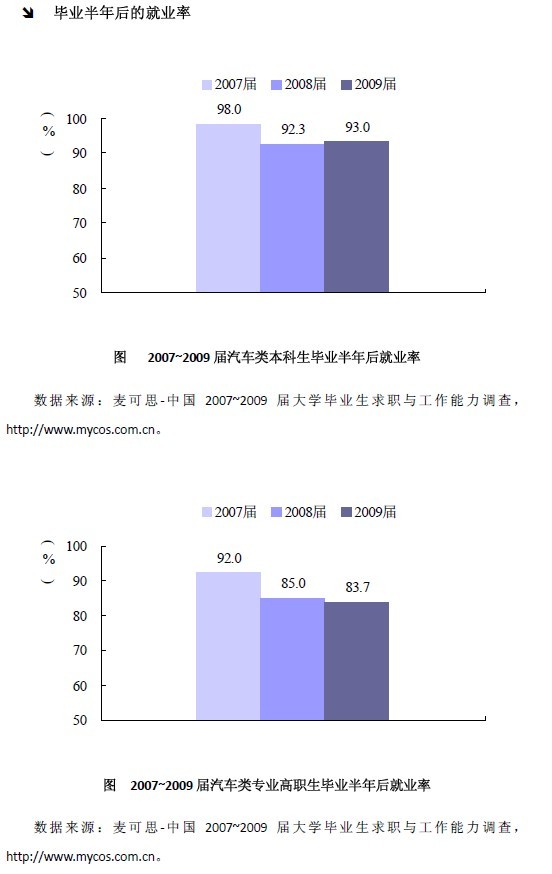 ? 2009届汽车类专业本科生毕业半年后的就业率为93.0%,高于上届(92.3%)0.7个百分点,比2009届非汽车类专业本科生毕业半年后的就业率(88.0%)高5个百分点。2009届汽车类专业高职生毕业半年后的就业率为83.7%,低于上届(85.0%)1.3个百分点,比2009届非汽车类高职毕业生毕业半年后的就业率(85.3%)低1.6个百分点。