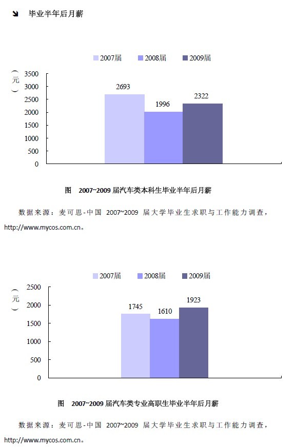 ? 2009届汽车类专业本科生毕业半年后月薪为2322元,高于2008届(1996元)326元,略低于2009届非汽车类专业本科生毕业半年后平均月薪(2369元)。2009届汽车类专业高职生毕业半年后月薪为1923元,略高与2009届非汽车类专业高职毕业生毕业半年后月薪(1889元)。