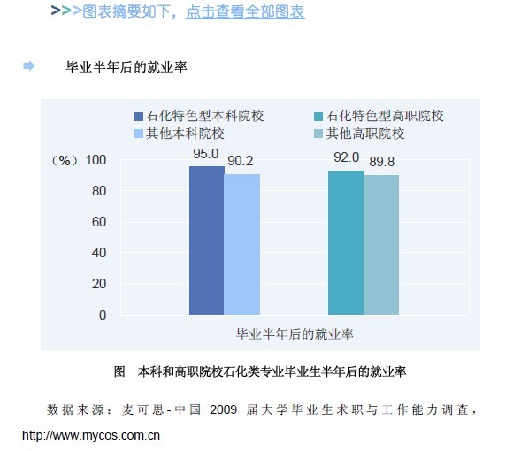 通过对比石化特色型院校中的石油化工类专业(以下简称石化类专业)毕业生和其他院校的石化类专业毕业生各项关键就业指标,我们发现,石化特色型院校毕业生的关键就业指标都较好,其长期积淀的石化行业特色学科优势依然存在,也是石化行业高等技术人才培养的主要支持力量。具体分析如下: