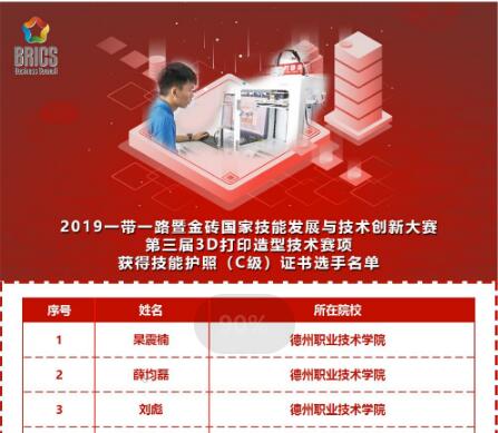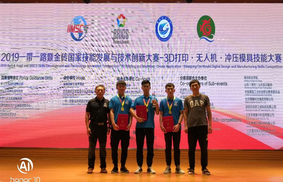 2019年,杲振楠、刘彪、薛俊磊三名同学在教师高志凯、支保军的指导下,获2019“一带一路”暨金砖国家技能发展与技术创新大赛3D打印造型技术3D打印造型技术比赛团体一等奖第一名,同时获得俄罗斯叶卡捷琳堡欧亚高科技公开赛决赛参赛资格。鉴于三名同学比赛成绩优异、技能突出,组委会特授予技能护照。