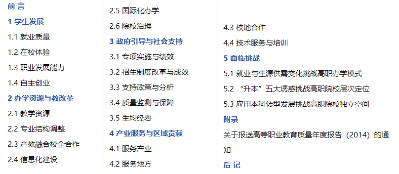 第四个大的方面,我们作为第三方,这次指出了高职教育质量方面的或者说发展方面的十大问题。第一个发展环境问题,政策不落实、不落地的问题,比如45页我们就有所提出。第二个财政经费得不到保障,我们在44页专门做了一个比较,都有明确的数字,中央财政专项的预算数问题还没有专门的实现。第三个教师队伍建设中的问题比较大,比如生师比等等都有提高,但是部分省份高达18:1。第四个问题,评价标准滞后的问题,在21、22页我们在指出成绩同时,但是也做了指出。第五个问题,院校学生参与社团活动的下降的问题。第七个问题招生考试改革的规范问题,我们在38页指出在高考制度上,有的省份步子太快,配套措施难以跟上。第八个问题,管理部门与院校对管理制度的落实存在偏差,这是我们多次提到的问题,比如第6页我们就说到了一些例子。我们本报告专门把附录作为文件对照,实际上我们也是高职高专处的朋友,这也是未来的做法,就是文件和执行的偏差度,第22页我们也指出了。第九个问题,年度报告现实,60%没有技术服务收入栏目的填写,40%的院校没有公示社会规范,有还是没有我们不知道,因为他不展示,所以我们第三方是比较有遗憾的。第十个问题我们专门指出升本的五大诱惑和本科转型的五大压力。