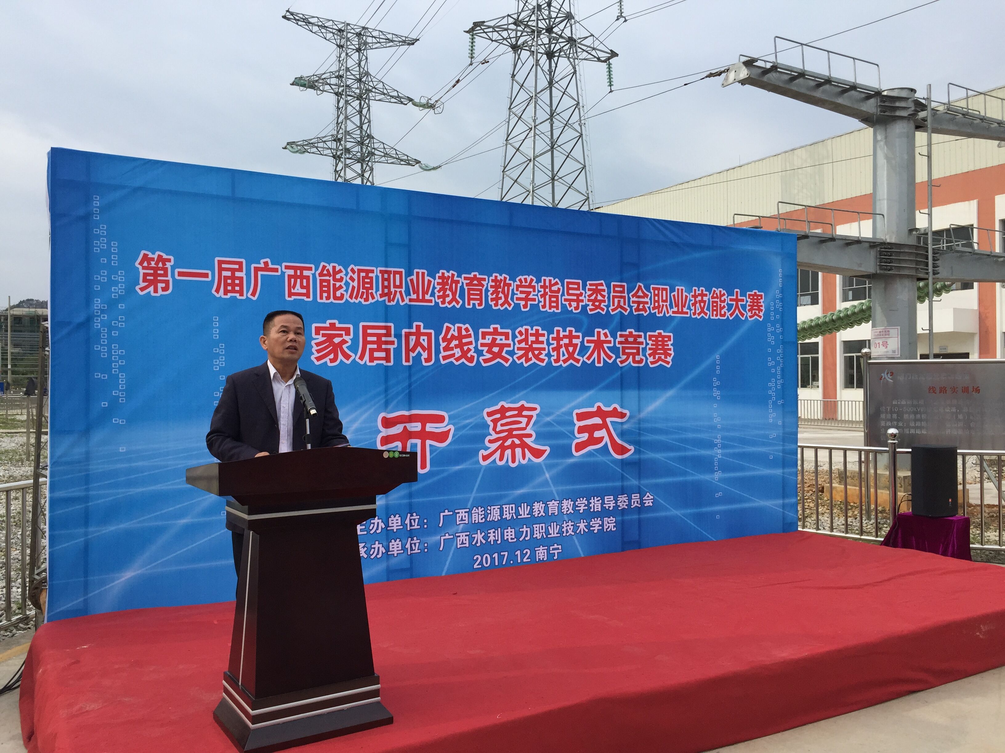 开幕式由广西水电学院张忠海副院长主持。广西能源行指委电力专委会主任、广西水电学院副院长何宏华为开幕式致辞,他对前来参加大赛的专家、老师和选手表示热烈欢迎,并指出教育厅成立自治区能源行指委是加强行业指导、评价和服务,深化产教融合、校企合作,加快发展我区现代职业教育的重要举措,“家居内线安装技术”技能竞赛项目是能源行指委开展行校企经验交流活动一项重要赛事,学院将尽最大的努力把本项大赛各项工作做好,并希望选手们赛出风格,赛出水平。裁判长由广西工业职业技术学院莫文火教授担任,开幕仪式上莫文火教授表示裁判组将严格遵守裁判纪律,根据比赛规程,公平、公正执裁;我院电力工程系王明豪同学作为学生代表进行郑重宣誓。