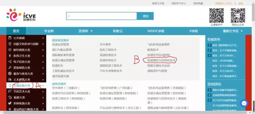 4.进入智慧职教学习平台,点击“交通运输大类”,选择“铁道通信与信息化技术”专业资源库进入
