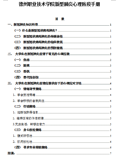 2.编制防疫手册,提供行动指导。心理健康教育中心编制了《德州职业技术学院新管肺炎心理防疫手册》,针对疫情期间学生可能会出现的心理问题提供了解决方案,也为我校教师学习如何应对学生的心理危机提供了行动指南。