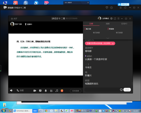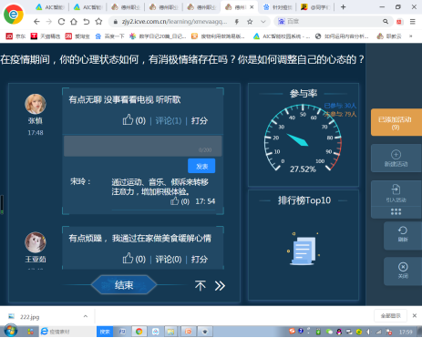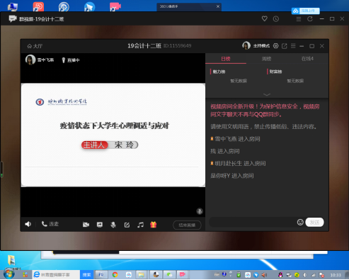 2.召开心理“云班会”,提升应对能力。通过qq直播钉钉视频等方式召开心理调适主题班会,了解同学们在疫情期间的心理状态,讲授疫情状态下,专业心理调适方法,为后续开展复学准备工作和疫情防控奠定基础。同学们积极参与,互动讨论活跃。