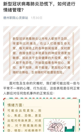 4.线上科普,稳定恐慌情绪。心理健康教育中心充分利用网络资源,通过“学工在线”、“德州职院心灵驿站”微信公众号向学生推送情绪管理小贴士、“冥想减压”小技巧,帮助学生们提高自我纾解、自我减压的能力。