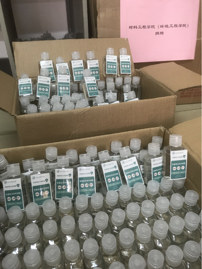 材料工程学院副书记潘逸说:“为更好地保障疫情期间广大学生复学防疫安全,我们党总支发挥自身专业优势,向学校国资处捐赠师生自制免洗洗手液1000瓶,向海外教育学院留学生捐赠免洗手液和自制的塑料衣架等生活物品。”