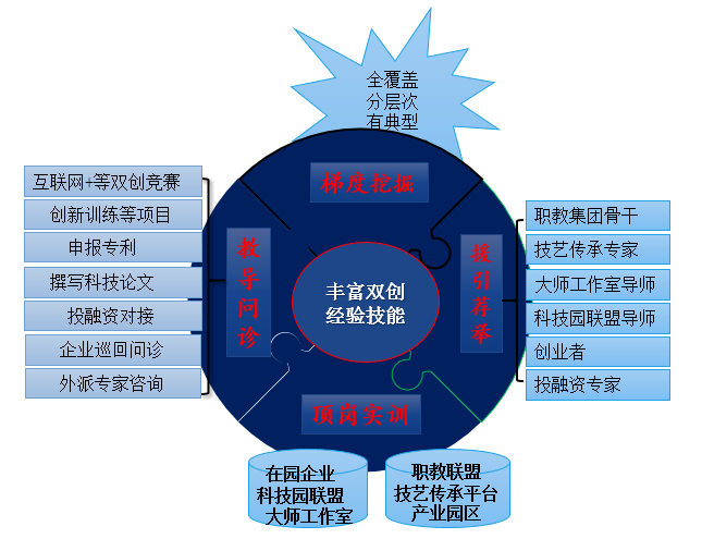 以大学生创新创业俱乐部、科创空间、虚拟仿真实验室作为校内苗圃基地,以创新创业学院、创新创业园区(孵化基地)作为孵化器,以校企共建职教集团、成果转移转化平台作为加速器,建立创新创业实践内核链条。以合作科研院所、企业共建载体作为苗圃基地,以大学科技园及功能平台作为孵化基地,以德阳市产业园区、四川省科技园联盟产业园区等作为加速器,建立创新创业实践外核链条。“双链条驱动”,健全创新资源集成、创新人才培养、科技企业孵化、科技成果转化和开放协同五大功能,营造优质的双创孵化环境。2017年至2021年期间,先后获四川省科技厅授牌“省级大学科技园”、“省级科技企业孵化器”;四川省委组织部认定“省级大学生创新创业俱乐部”;四川省大学科技园联盟“最佳进步奖”、“最佳产业融合奖”;四川省人力资源和社会保障厅认定“省级大学生创新创业园区(孵化基地)”;四川省科技厅认定“有效省级大学科技园”;共青团省委授牌“成德眉资青年创新创业联合孵化基地”; 四川省经济和信息化厅认定“四川省级小型微型企业创业创新示范基地;教育部认定装配式建筑虚拟仿真实践基地;教育部认定第二批示范性职业教育集团(联盟)培育单位。